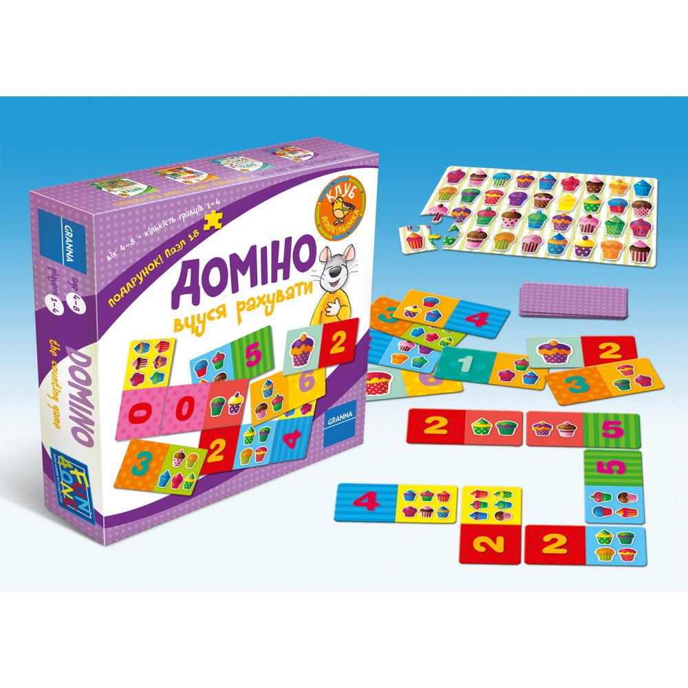 Игровой набор состоит из 28 плотных карточек домино с цифрами и мафинами, правил игры, а также пазл в подарок!