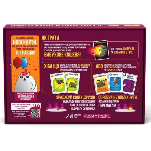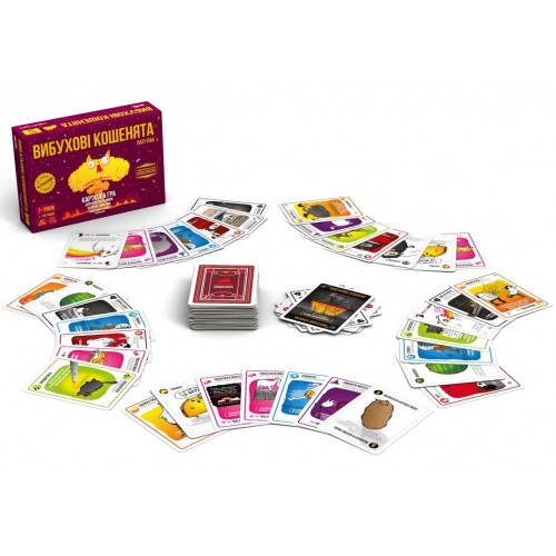 В настольной игре Взрывные котята: пати-пак (на украинском) игроки будут разыгрывать карты с руки и тянуть карту из колоды. В колоду замешаны карточки "Вибухове кошеня", вытаскивая которую вы взрываетесь и выбываете из игры.