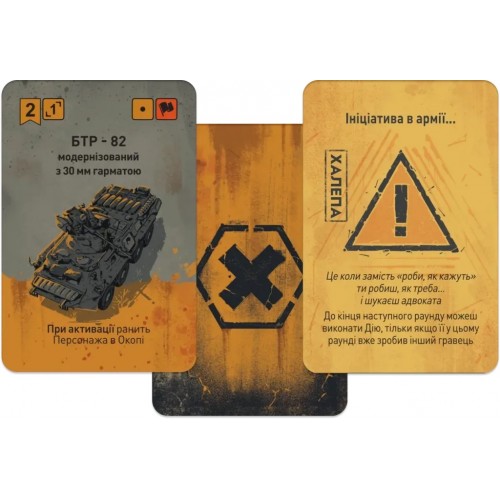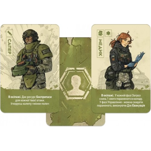 - Рекрутинг - возьмите двух Персонажей из колоды и положите одного из них в свой Экипаж, Штаб или в Окоп. Карту с другим персонажем положите в середину колоды;