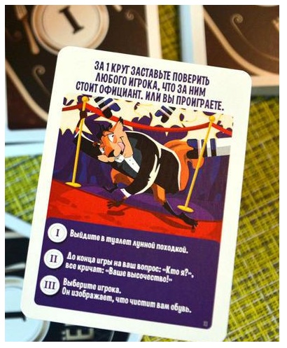 Один гравець тягне карту з верху колоди і виявляє там якесь завдання. Ну наприклад таке - "З закритими очима, по запаху, вгадайте яку купюру вам показує сусід справа" або таке - "За 30 секунд назвіть хоча б 3 подвигу Геракла" або взагалі - "Виберіть незнайомця, 1 хвилину подумки наказує йому обернутися, якщо не обернеться - ви програли ".