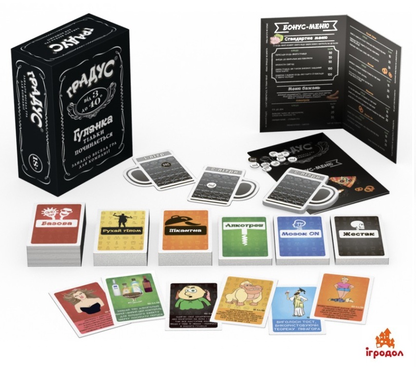 Гра Градус - українська застільна гра для вечірки. Градус (укр.) - гра, в якій гравці буде трохи випивати і виконувати різні завдання - різного рівня складності і пікантності - в залежності від кількості випитого:)