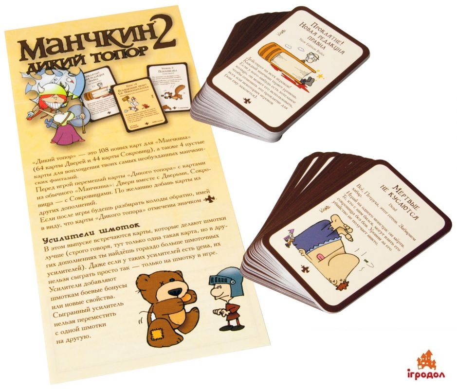 Манчкин 2 Дика Сокира - додаток, яке подарує любителям базової гри нові картки і нові можливості для розвитку свого персонажа і всілякого пакостнічанія іншим гравцям!