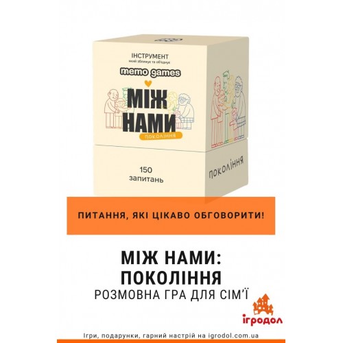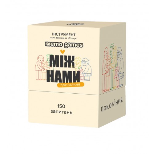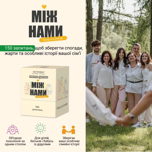 Між нами: Покоління UA - настільна гра, в якій різні покоління однієї сім'ї зможуть поділитися з близькими своїми спогадами, веселими історіями та прожитим досвідом. Це гра, в якій зустрічаються минуле, сьогодення і майбутнє!