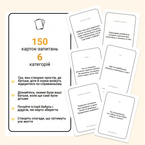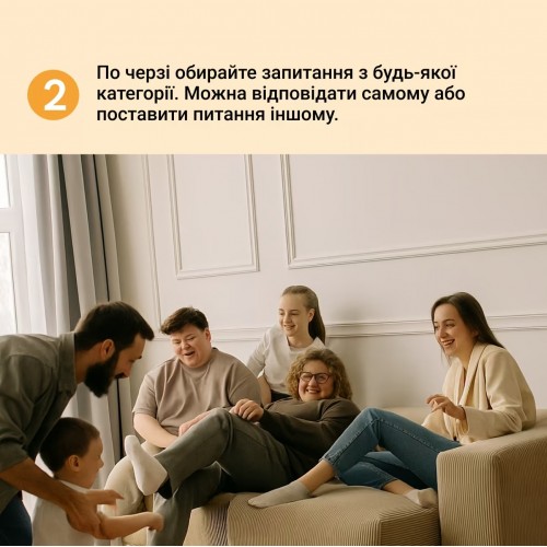 150 карток з питаннями з шести категорій подарують вам незабутній вечір одночасно для декількох поколінь вашої родини!