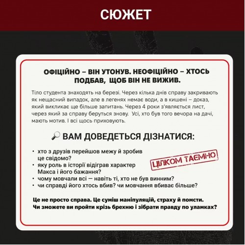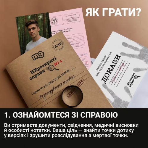Нерозкриті справи 4 - настільна гра, в якій гравці на кілька годин перетворяться на справжніх детективів і спробують встановити істину у справі про смерть студента в 2018 році в Київській області. Вам належить вивчити всі матеріали справи і встановити істину - чи дійсно це був нещасний випадок або це було вбивство?