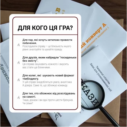 Детективну гру Нерозкриті справи (справа №4) можна проходити і самостійно, однак, цікавіше все ж буде в компанії. Гра також чудово підійде для тімбілдингу або цікавих сімейних вечорів. Це гра для тих, хто хоче відчути себе справжнім детективом. Це не просто гра, а повноцінне розслідування з продуманими деталями.