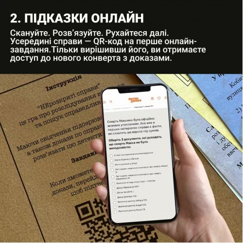 - Усередині папки - QR-код на перше онлайн-завдання. Вирішіть його і отримайте доступ до нового конверту з доказами.